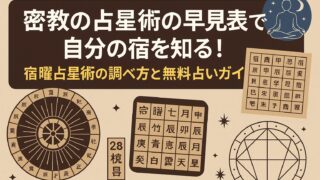 占星術 密教の占星術の早見表で自分の宿を知る!宿曜占星術の調べ方と無料占いガイド 密教占星術の早見表で自分の宿と運命を知ろう。無料ツールで宿曜占星術を調べ、密教占星術の早見表から魂のテーマを読み解くガイドです。 2025.10.08 占星術