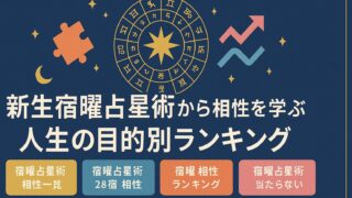 占星術 新生宿曜占星術から相性を学ぶ人生の目的別ランキング 新生宿曜占星術の相性で人間関係を深く理解し、新生宿曜占星術の相性を恋愛や結婚や仕事に活かす方法をランキングと一覧で解説します。 2025.10.02 占星術