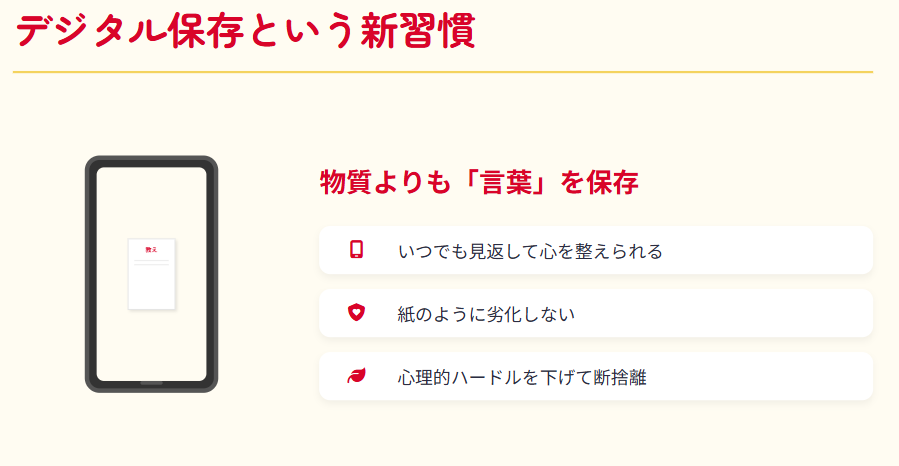 - 断捨離しやすい:「データとして残っている」という安心感があるため、実物を手放す際の心理的ハードルがぐっと下がります。