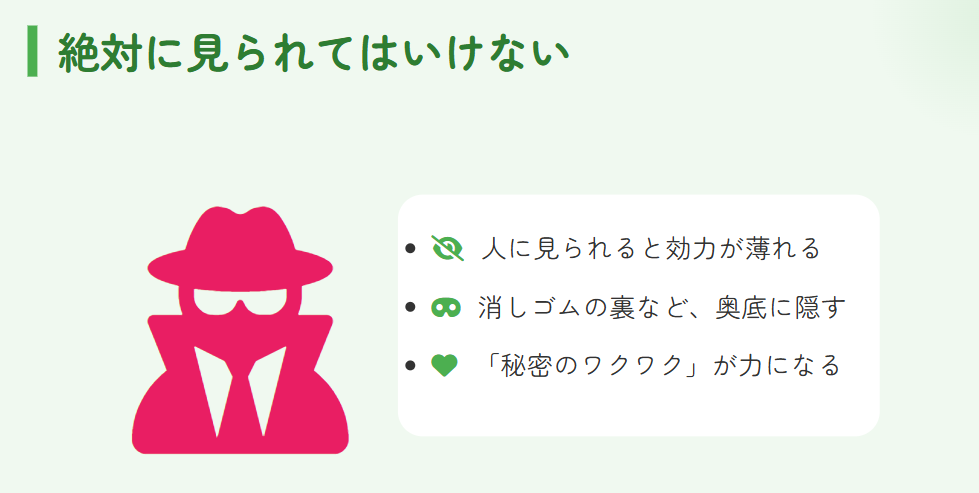おまじないの鉄則として、「人に見られると効力が薄れる」と言われることが多いです。筆箱の中でも、消しゴムの裏側や、あまり開けないポケットの奥底など、友達がふざけて筆箱を開けても絶対に見つからない場所に忍ばせておきましょう。秘密を守り通すドキドキ感が、さらにおまじないの力を高めてくれます。