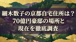 70億円とも噂される細木数子さんの京都の自宅住所の場所や現在の様子を徹底調査しました。右京区とされる細木数子の京都の自宅住所には、宗教施設としての壮大な建設背景や後継者かおり氏への想いが込められています。取り壊し説の真相や豪華な内装など、伝説の邸宅の全貌を詳しく解説します。